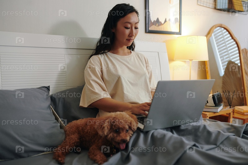 Собака, сидящая рядом с хозяином на кровати