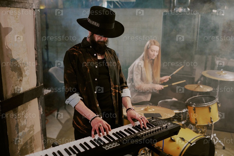 Бородатый человек в шляпе играет на синтезаторе