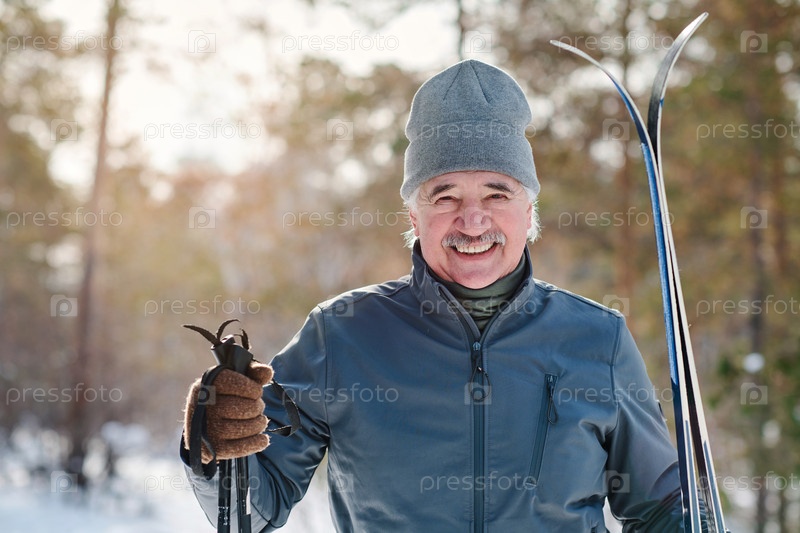 Счастливый старший человек со лыжами в парке