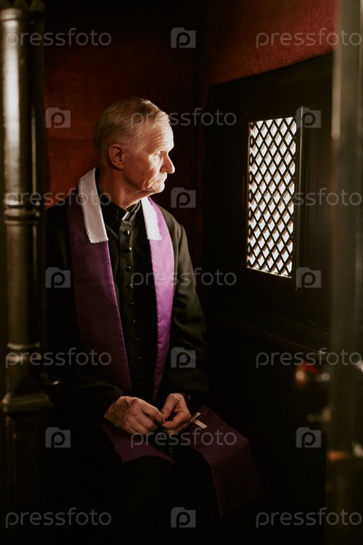 Старший священник сидит в исповеди
