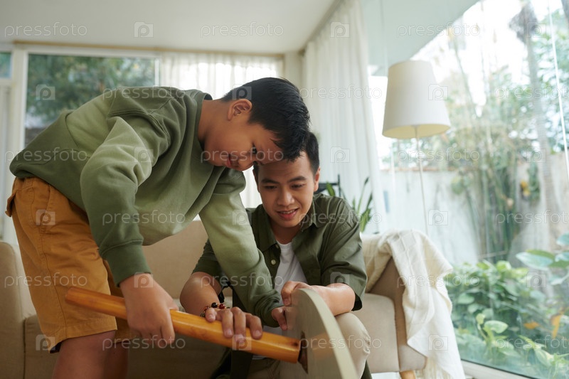 Отец и сын собирают мебель