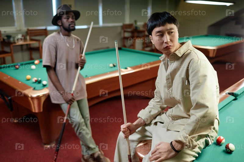 Азиатский мужчина сидит за бильярдным столом в клубе
