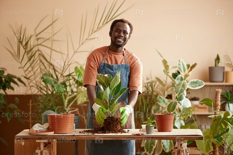 Улыбающийся чернокожий мужчина, размахивающий зелеными растениями и смотрящий на камеру