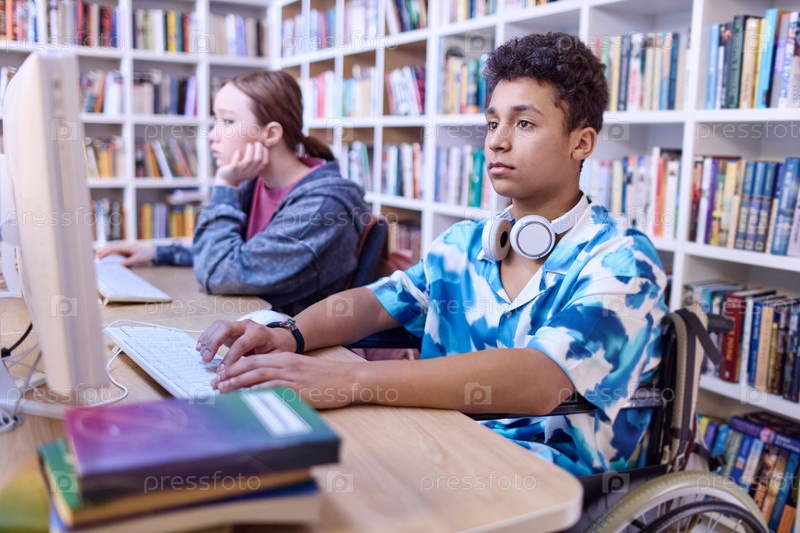 Мальчик, использующий инвалидное кресло на уроке компьютера