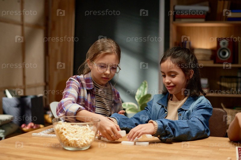 Две умные девочки играют в домино дома
