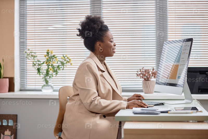 Молодая чернокожая женщина использует компьютер на рабочем месте
