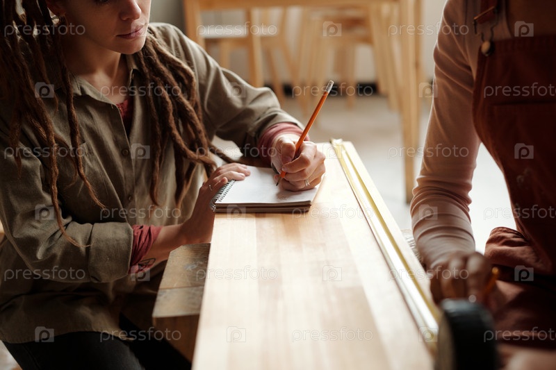 Молодая женщина в серой рубашке делает заметки