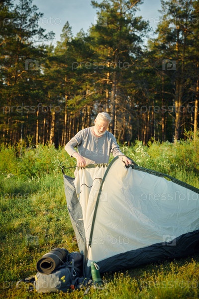 Старший мужчина устанавливает лагерную палатку