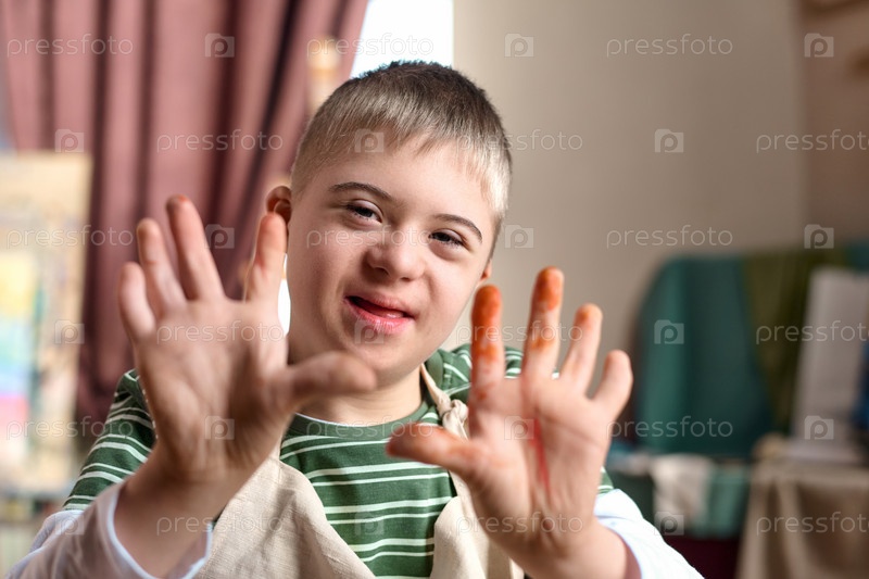 Близкий подросток с синдромом Дауна показывает руки, покрытые краской