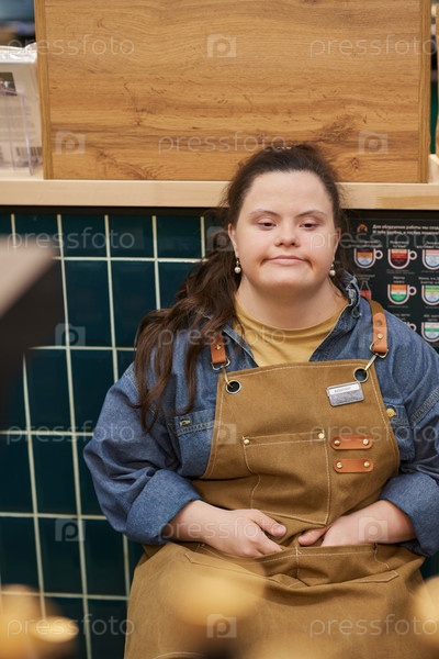 Девушка с синдромом Дауна работает в кафе, делает перерыв и сидит на стуле