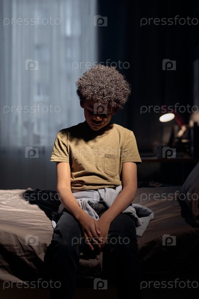 Мальчик-подросток сидит на кровати в драматическом свете
