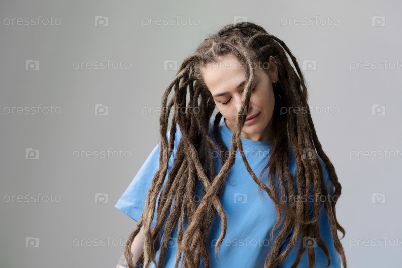 Женщина с длинными дредольками, стоящая на белом цвете со закрытыми глазами