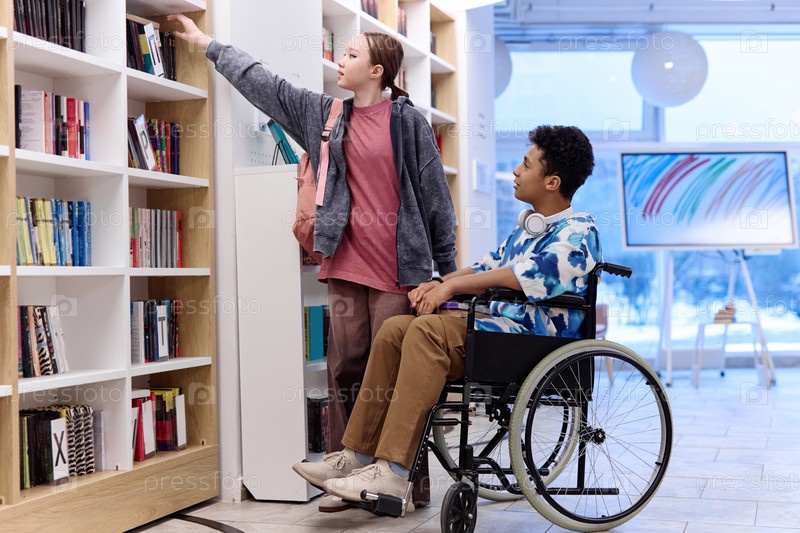 Два подростка в библиотеке с мальчиком-инвалидом, выбирающим книги