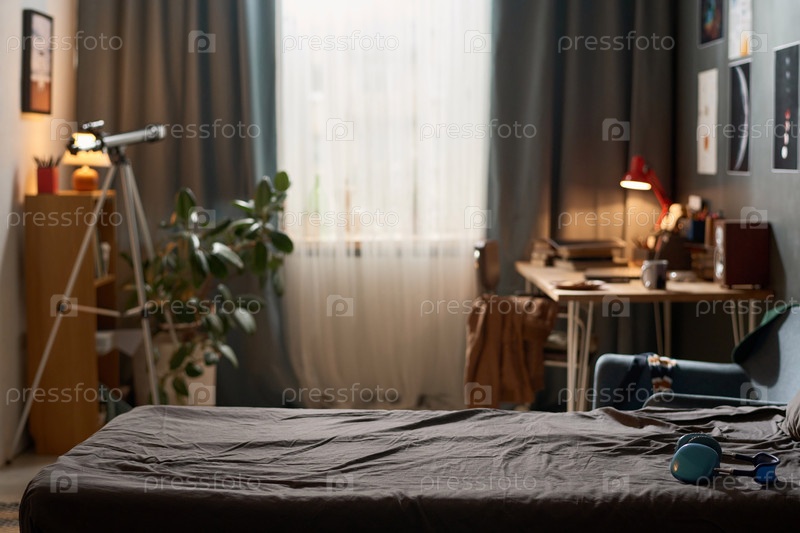 Пустой интерьер комнаты для мальчиков-подростков с акцентом на незаготовленную кровать