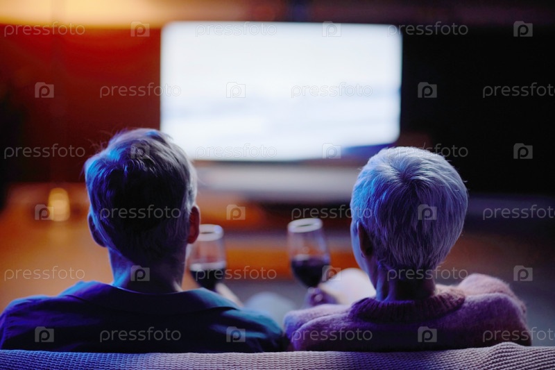 Посмотрите на старшую пару, которая смотрит телевизор дома