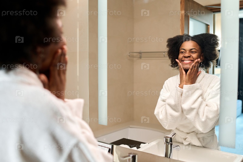 Улыбающаяся чернокожая женщина смотрит в зеркало