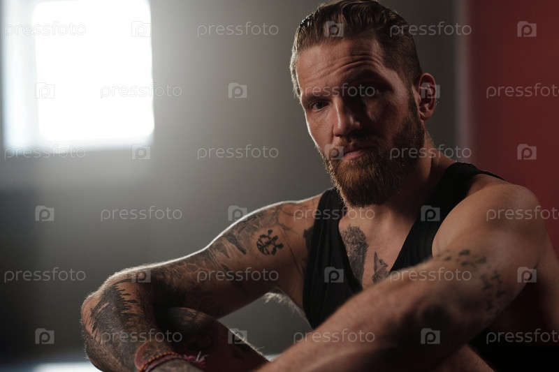 Молодой серьезный бородатый мужской спортсмен