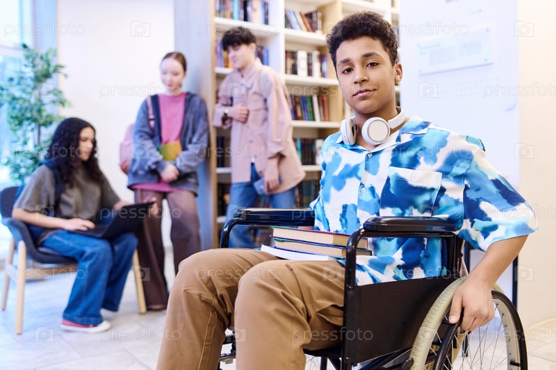 Мальчик с инвалидностью в школьной гостиной со студентами