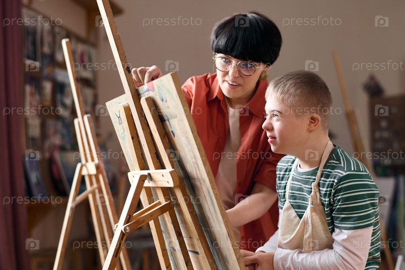 Улыбающийся мальчик с синдромом Дауна, сидящий рядом с локотью в классе искусства