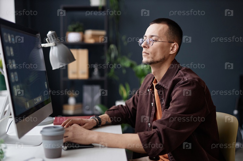 Азиатский мужчина, использующий компьютер на рабочем месте