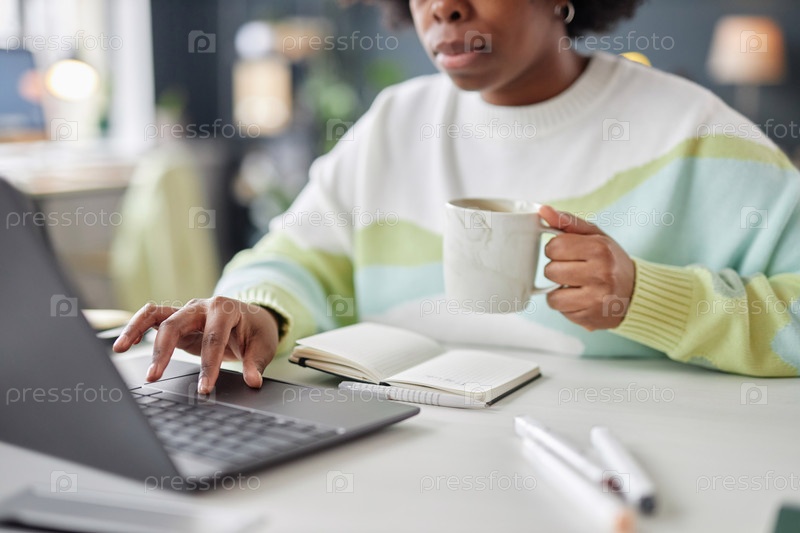 Черная женщина печатает на клавиатуре в офисе, держа кофейную кружку