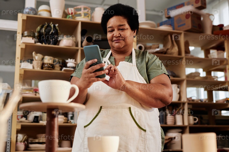 Чёрная старшая женщина использует телефон в керамическом магазине