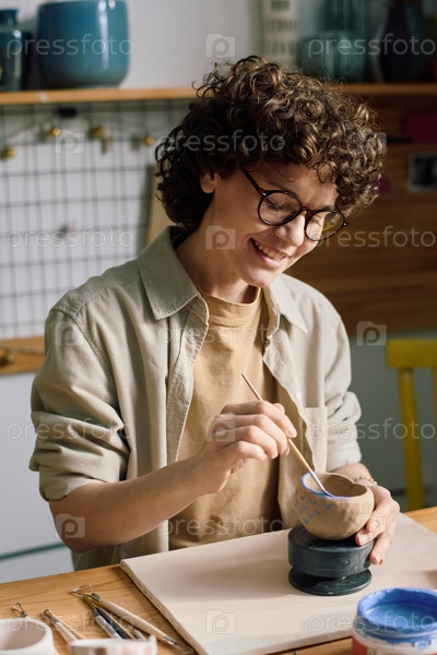 Веселая женщина украшает ручной миску