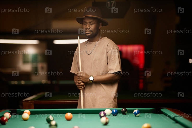 Чернокожий мужчина держит ключевую палку в бильярдном клубе