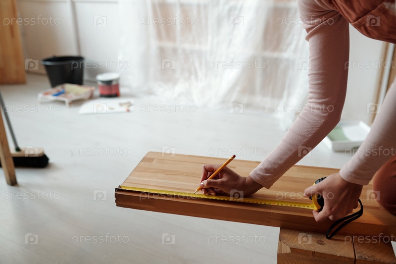 Работник, принимающий меры по деревянной скамейке