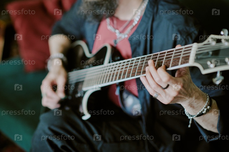 Непризнанный бородатый мужчина играет на гитаре