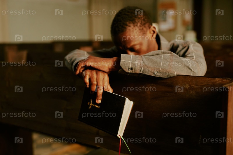 Непризнанный чернокожий мужчина молится в церкви