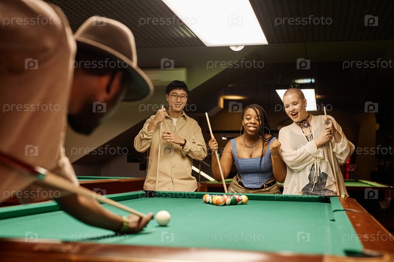 Разнообразная группа людей смотрит, как друг играет в бассейн