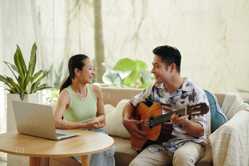 Играть на гитаре и смеяться вместе дома