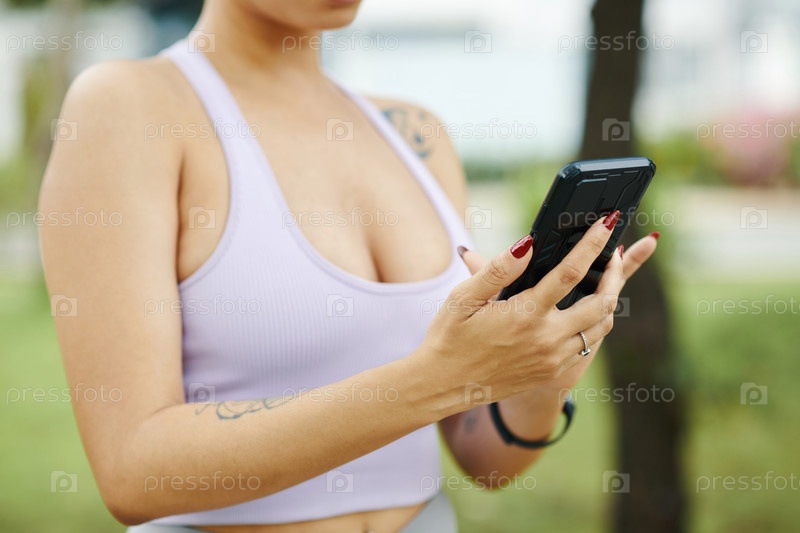 Женщина, использующая смартфон во время активной деятельности на открытом воздухе