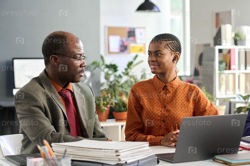Молодая чернокожая женщина разговаривает со старшим коллегой в офисе