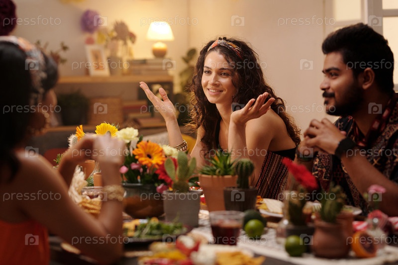 Счастливая женщина разговаривает с одним из гостей
