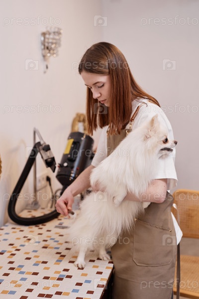 Женщина, ухаживающая за милой собакой-померанией