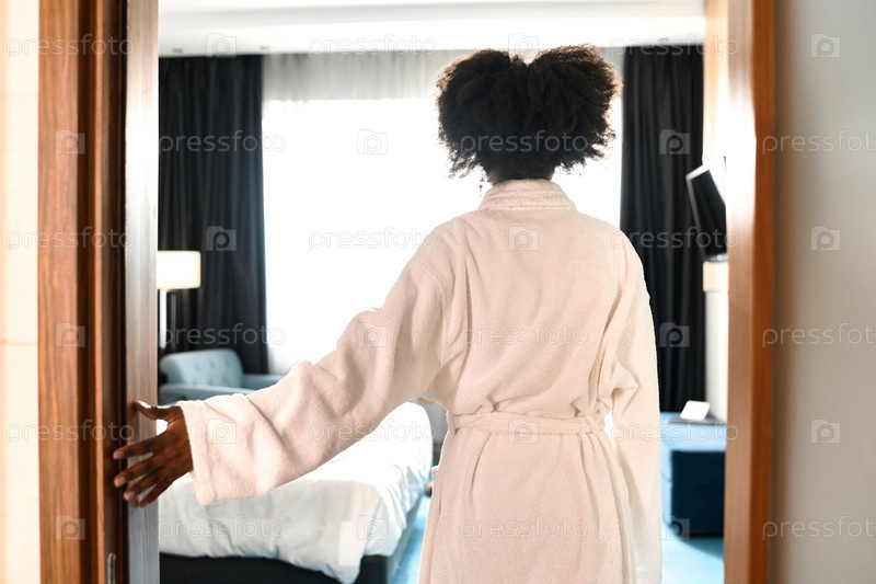 Задним взглядом женщина в халате, входящая в гостиничный номер