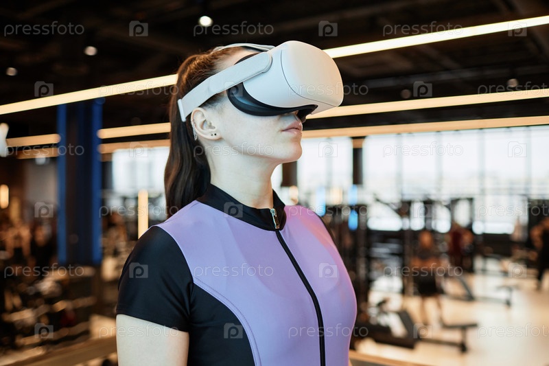 Девушка, которая носит VR-прибор в тренажерном зале