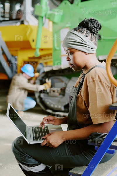 Молодая чернокожая женщина-фабричная рабочая использует ноутбук