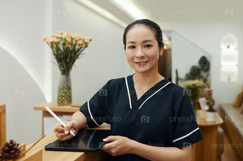 Салонный рецептор, подписывающий документы Spa