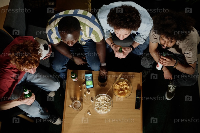 Молодые мужчины смотрят спортивное событие снизу вверх