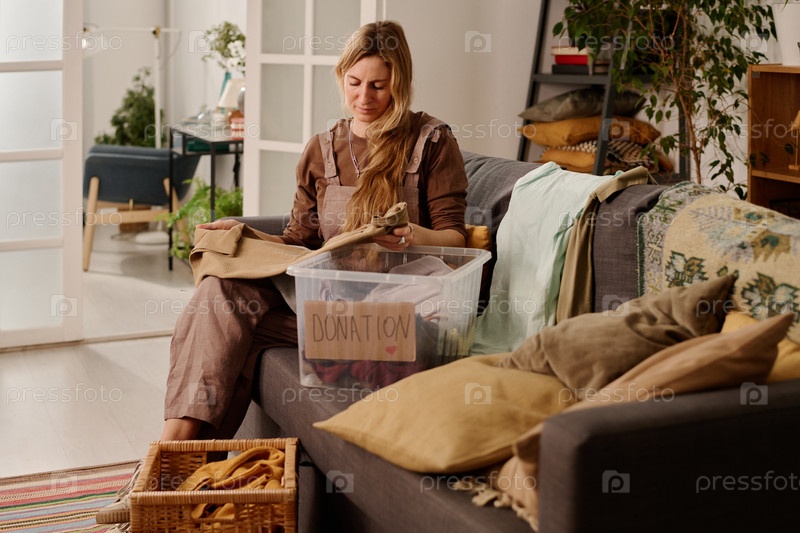 Женщина выбирает и складывает старую одежду