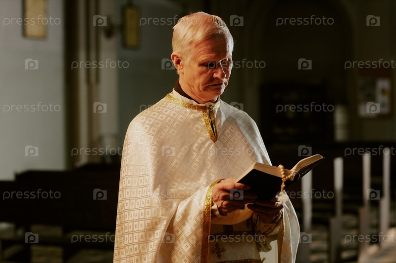 Старший католический священник читает Библию