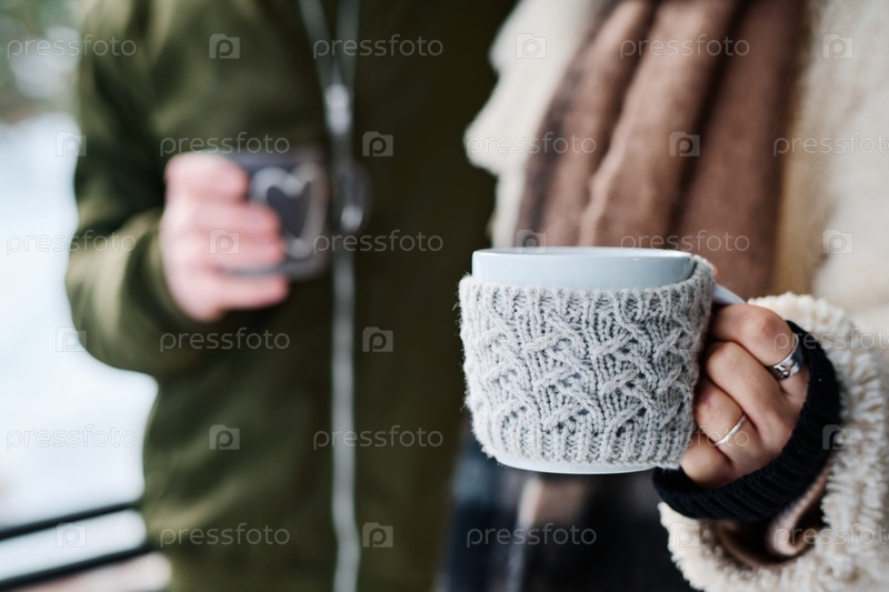 Непризнанная пара с кружками в руках в зимний день