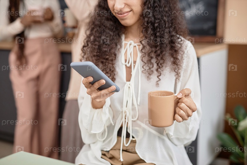 Молодая кудрявая девушка, использующая мобильный телефон