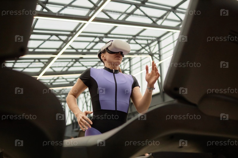 Девушка с низким углом, носящая VR-гарнитуру и бегущая