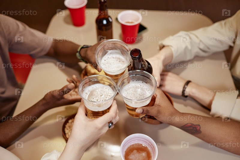Высокий вид друзей, пьющих пиво в кафе