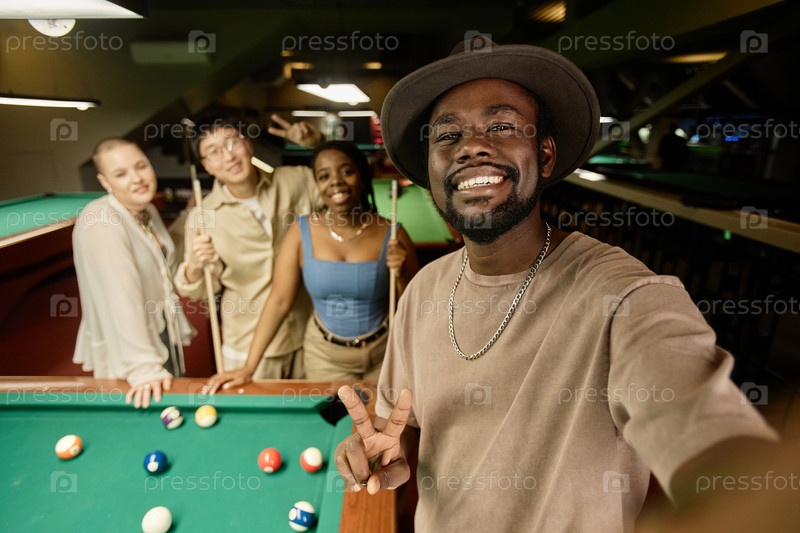 Черный мужчина делает селфи с разной группой друзей в бильярдном клубе