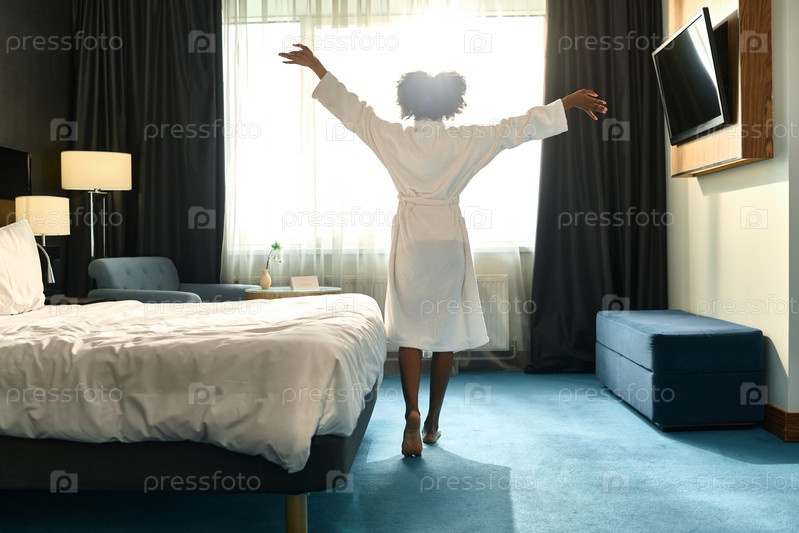 Женщина танцует в спальне с солнечным светом